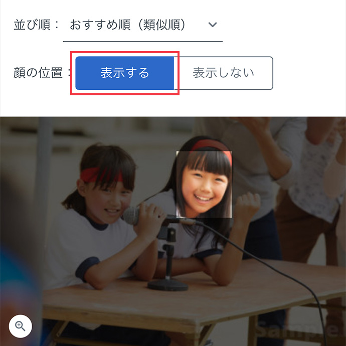 絞込み結果で顔の位置「表示する」ボタンを押すと、写真のどこに写っているか分かります。